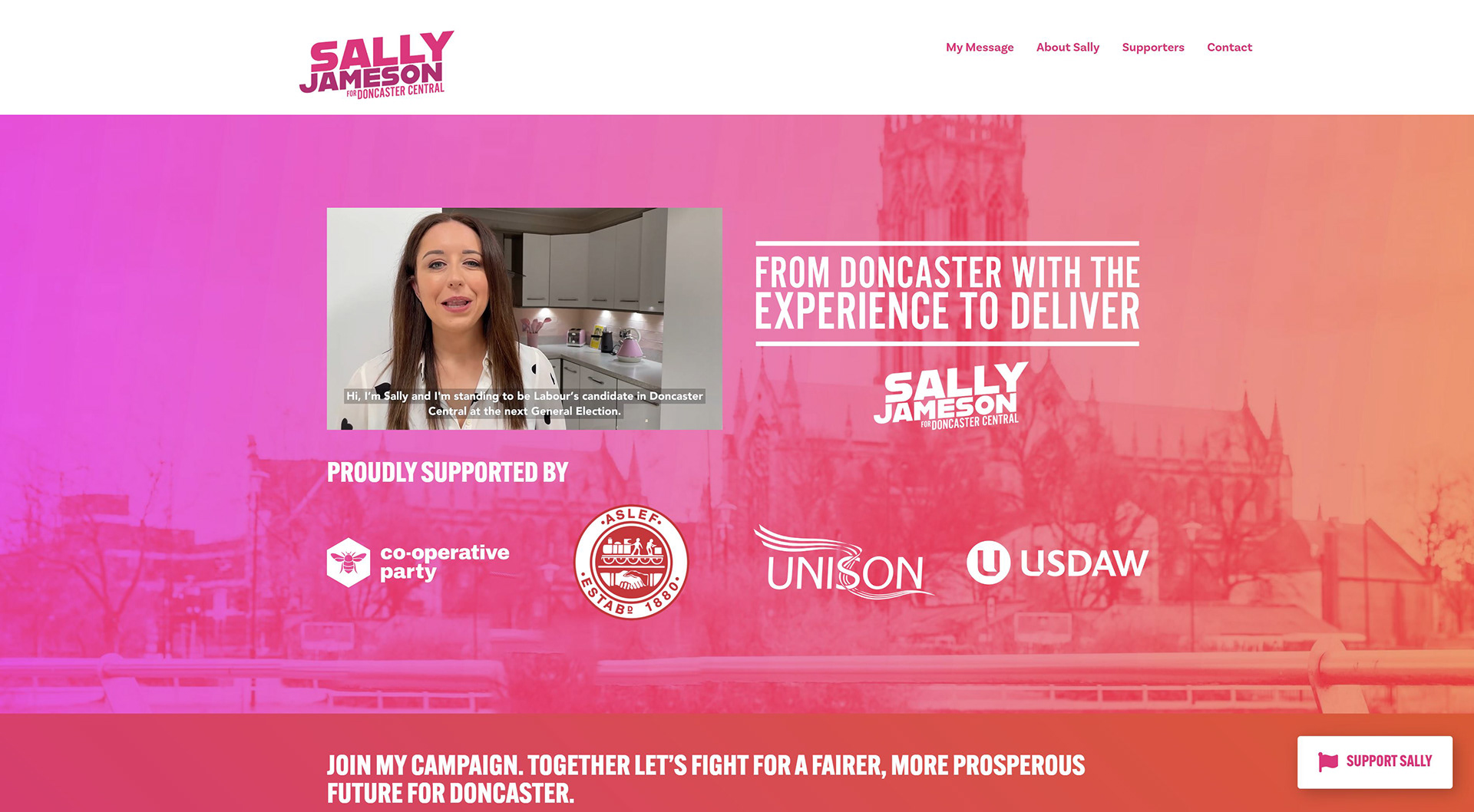 In early 2022 I was commissioned to help Sally Jameson's selection campaign to become the Labour candidate for Doncaster Central. Building on a strong central brand we were able to effectively communicate her message to the selectorate through leaflets, digital media and her website. In July 2024 she was elected with a majority of over 9,000.